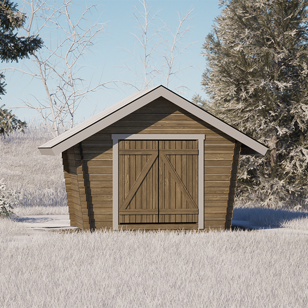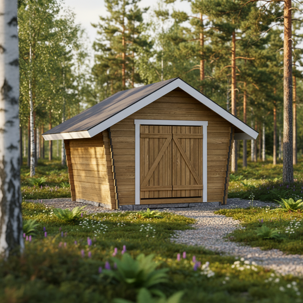 Vinoumpiseinäinen rakenne + pitkät räystäät – suojaa lumelta ja sateelta, 42×145 mm Lapin punahonka – kestävä ja mittapysyvä, Suunniteltu pohjoisen lumi- ja tuulikuormille (lumikuorma 300 kg/m²), Markkinoiden korkein vakiona: seinän laidalta 2000 mm, harjalla vapaa sisätila n. 2615 mm, Reilunkokoinen pariovi helpottaa käyttöä arjessa
