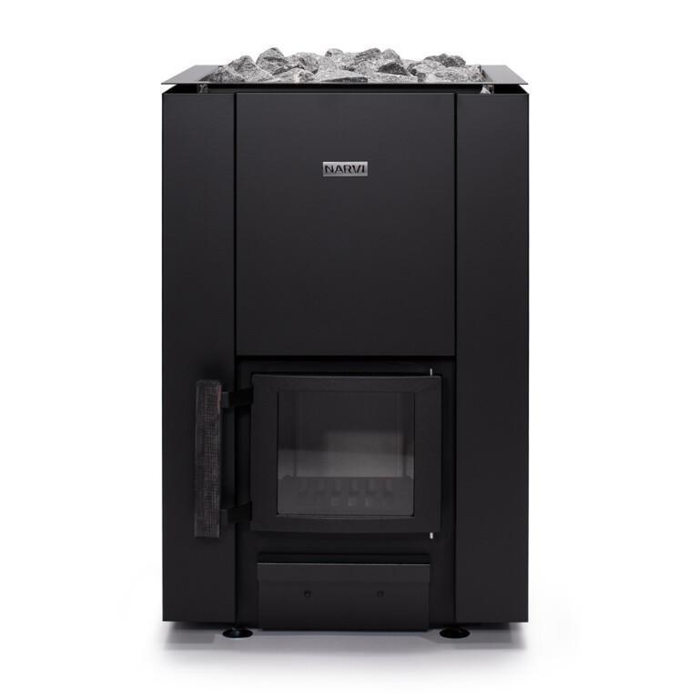 Puulämmitteisissä Narvi Kaamos -kiukaissa koruton muotoilu on toteutettu kestävin materiaalein. Kiukaan ulkokuoren kulmikkuus, pelkistetty musta yläkehys ja matta pinta luovat tyylikkään ja ajattoman ilmeen. Iso kivimäärä takaa tasaiset ja miellyttävät löylyt, jotka hemmottelevat saunojia.